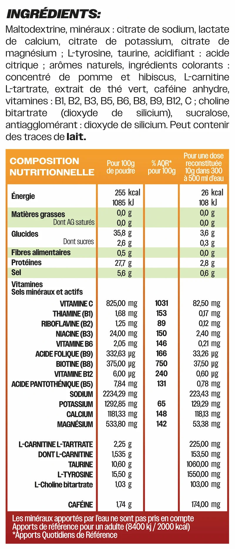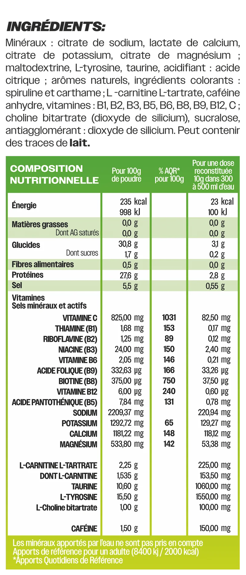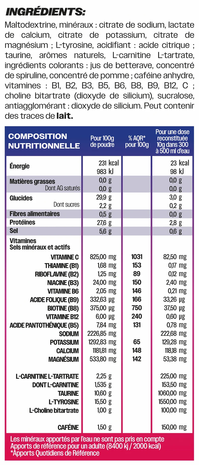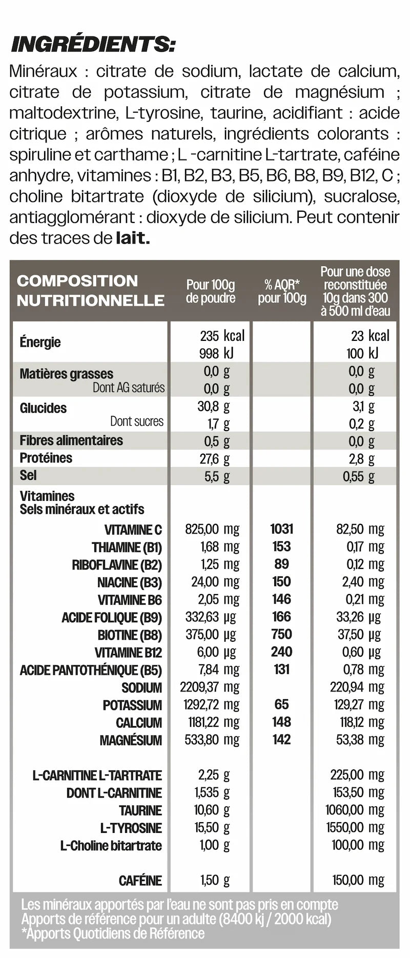 Les arômes et colorants sont 100% naturels.Le reste de la formule (comme certains acides aminés, vitamines ou la caféine) est de synthèse, mais sûr, stable et parfaitement maîtrisé — comme dans la plupart des compléments de qualité.Aucun ingrédient d’origine animale, ni substance inutile ou douteuse.