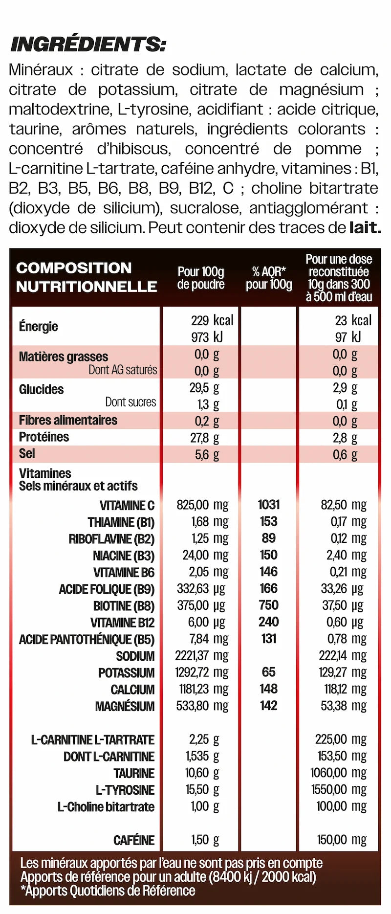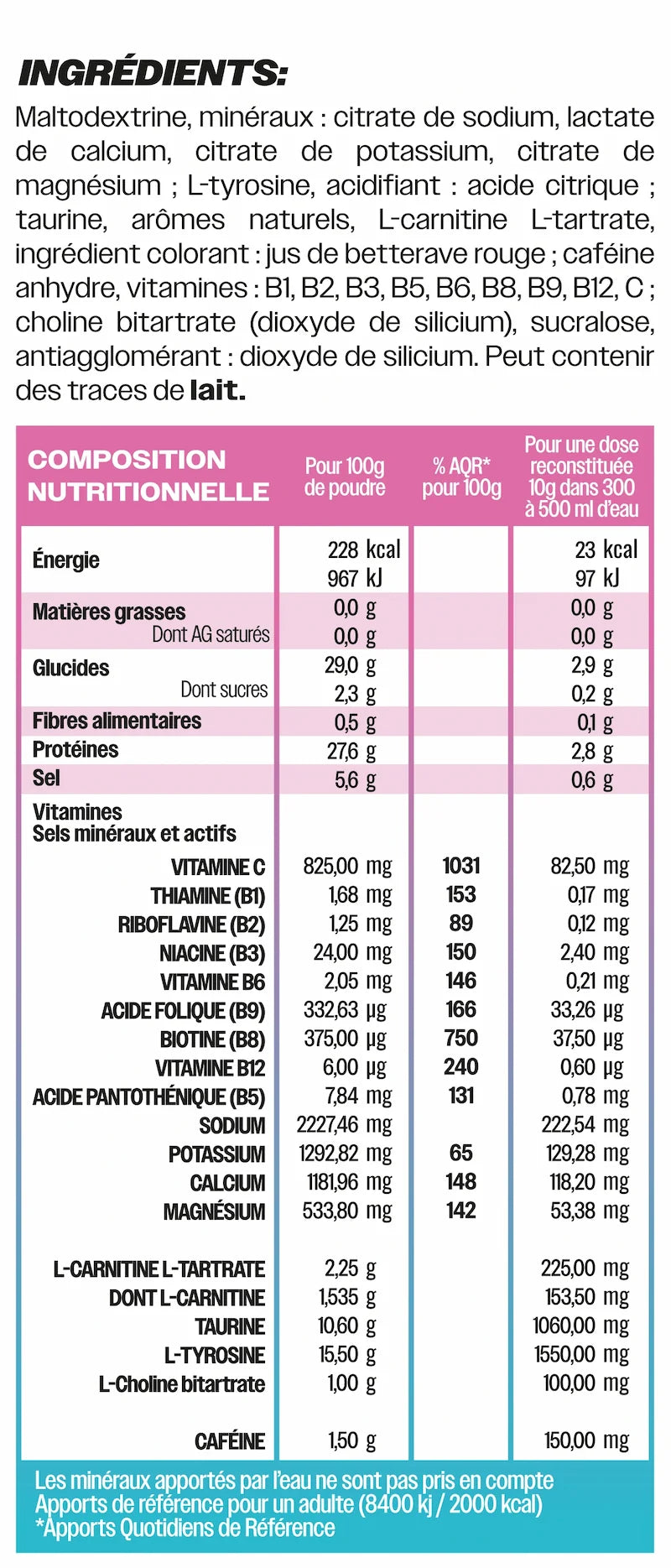 Les arômes et colorants sont 100% naturels.Le reste de la formule (comme certains acides aminés, vitamines ou la caféine) est de synthèse, mais sûr, stable et parfaitement maîtrisé — comme dans la plupart des compléments de qualité.Aucun ingrédient d’origine animale, ni substance inutile ou douteuse.